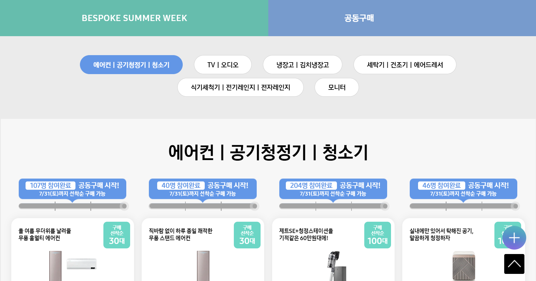 비스포크 서머 위크를 클릭하기 전에 아래를 둘러보니 충격적인 모습이 보였습니다. 공동구매라고 해서 비인기 제품이나 재고 떨이 특가전이나 대충 기획했을 줄 알았더니 다들 신상 같아요. 여름에는 겨울 제품 떨이하고 겨울에는 여름 제품 떨이하는 공동구매 많은데, 여기는 그냥 삼성에서 생산하는 제품 모두 공동구매 적극 참여 중인 것이 아니겠습니까? 삼성 에어컨, 삼성 공기청정기, 삼성 청소기. 삼성 TV와 오디오. 삼성 세탁기, 건조기, 에어드레서. 식기세척기와 전기레인지 전자레인지. 끝으로 삼성 모니터까지!