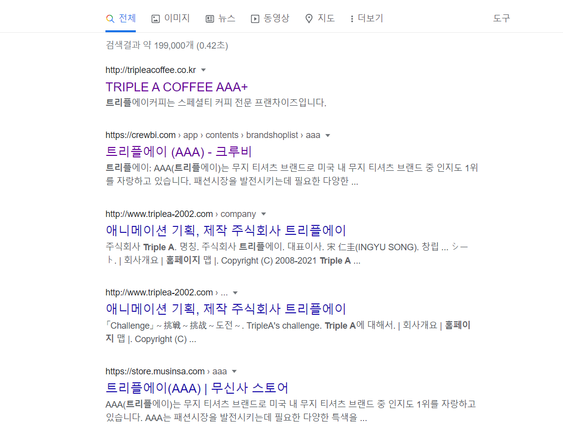 양현종 마이너리그 성적이 궁금해서 찾아보고 싶었는데 마이너리그 홈페이지를 찾지 못해서 애먹었네요. 그냥 구글에 한글로 트리플에이 검색했다가 엉뚱한 검색 결과만 나와서 잠시 웃었습니다. 예를 들면 아래 사진처럼 TRIPLE COFFEE AAA+ 트리플에이 커피 프랜차이즈 홈페이지가 가장 상위에 노출되고 있고, 그 아래에는 트리플에이 AAA 크루비라는 무지 티셔츠 브랜드, 애니메이션 기획 제작 주식회사 트리플에이... 그리고 무신사 스토어에서도 트리플에이 브랜드가 입점해서 무지 티셔츠를 팔고 있는 것 같네요.