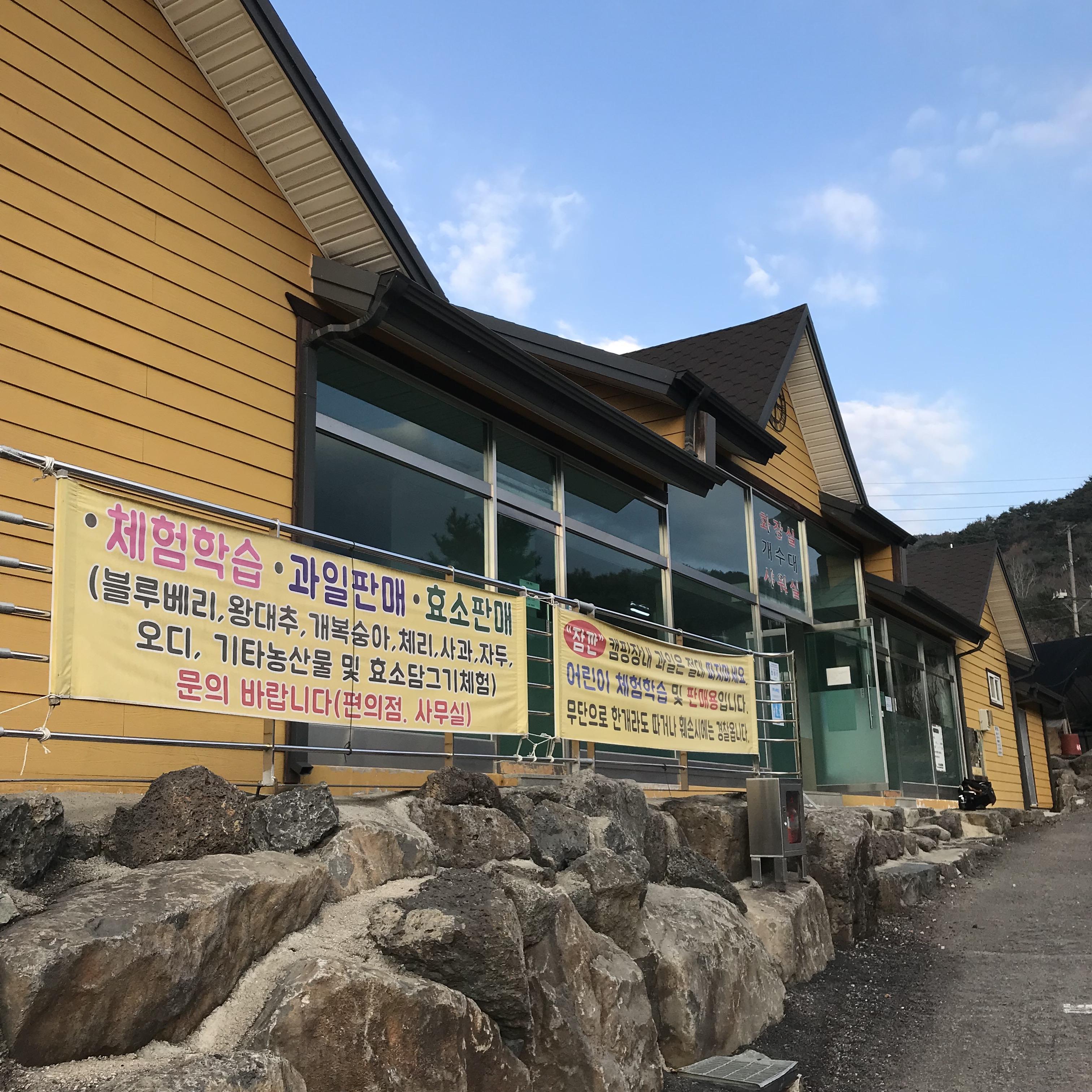 캠핑장이 만들어지기 전에 대규모 농원이었던 땅이었던 것 같습니다. 사장님께서 농사를 지으면서 캠핑장도 함께 운영하고 계시네요. 계절에 따라 체험학습도 가능하다고 하니 아이들과 함께 경험해보고 싶은 마음도 생겼어요. 하지만 오늘은 영하 날씨가 예상되는 겨울 캠핑이라서 마음에 여유가 없네요. 겨울 캠핑은 처음이라서 살짝 두렵기도 합니다. 관리소에 들어가니 가산농원에서 직접 농사 짓고 정성으로 담근 각종 효소도 판매하고 있어요. 블루베리, 왕대추, 개복숭아, 체리, 사과, 자두, 오디 등 정말 많은 과실로 효소를 담그시나봐요.