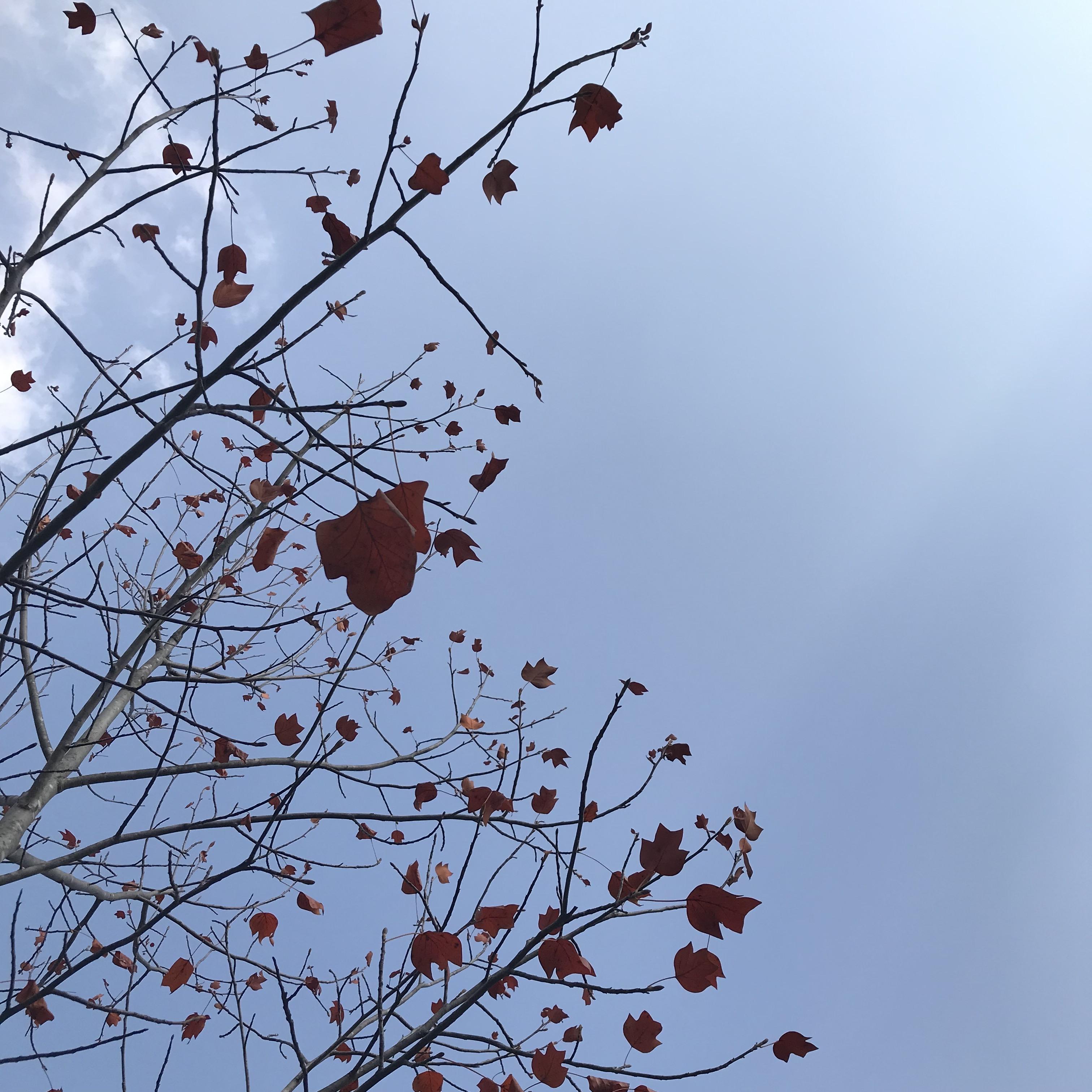 나무 이름은 모르겠지만 참 예쁜 나뭇잎과 하늘을 만났습니다. 나뭇잎 테두리가 안쪽으로 살짝 말려 들어가면서 예쁜 모양을 만들었고 색감도 참 우아한 오렌지빛이었어요. 홍시 색깔 혹은 한화생명 로고에 쓰인 주황인데 어떻게 말로 표현할 수 없는 컬러라서 곤란하네요. 아무튼 정말 예쁜 나뭇잎이었습니다.