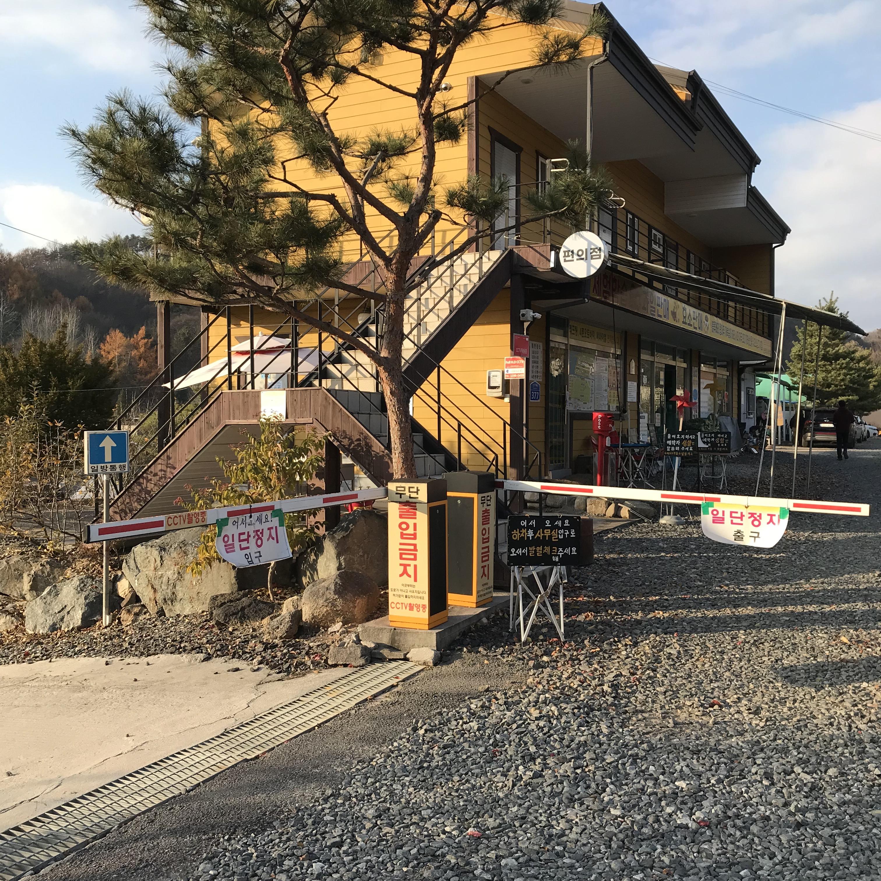 철원 가산농원캠핑장 입구입니다. 입구에서 사이트 위치에 따라 양쪽으로 길이 나뉘는데 저는 H구역이라서 오른쪽으로 통과할 예정입니다. 입구에 본사 건물이... 관리실이 있고요, 여기서 편의점 역할도 하고 있어서 필요한 물품을 구입하거나 문의사항을 확인할 수 있겠습니다. 오랜만에 왔지만 사장님 얼굴은 그대로시네요. 물론 저를 기억하지는 못하시겠지만 반갑게 인사하며 안내사항을 전달받았습니다.